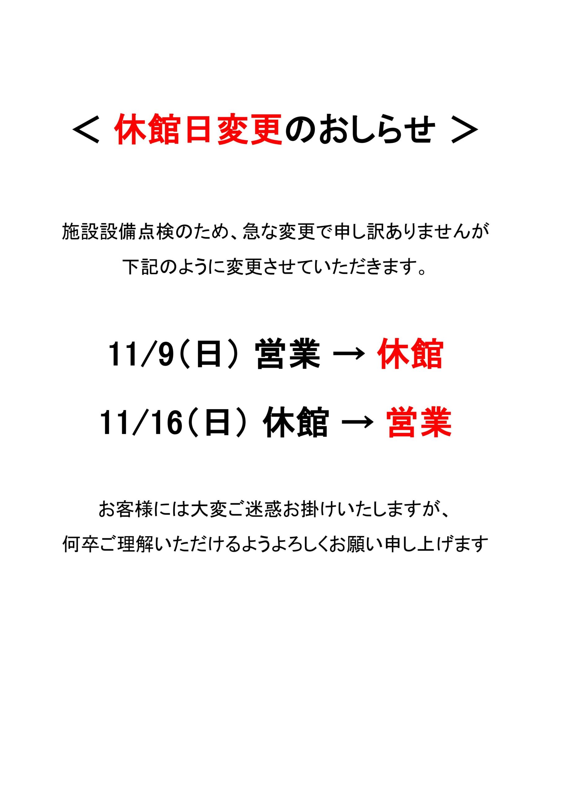いつもプレジールをご利用いただきありがとうございます。 11月の休館日変更のお知らせです。
