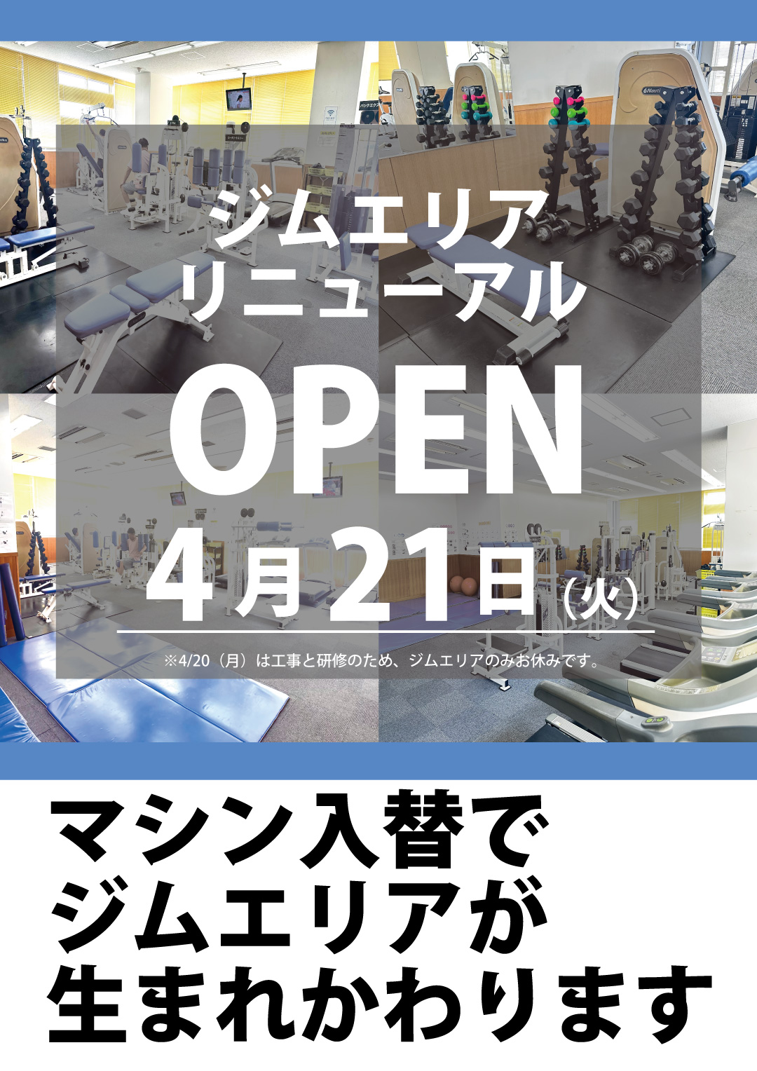 4月20日(月)はジムエリアのみ工事と研修の為お休みです。 プールはいつも通り使えます!!