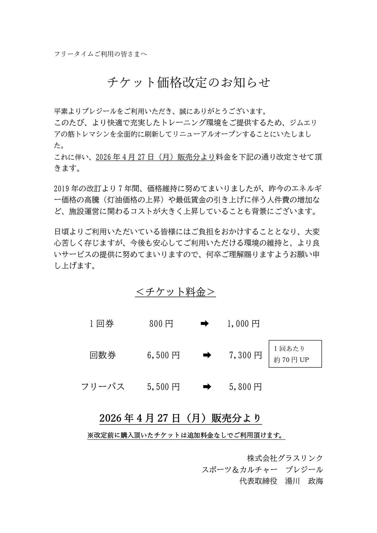 リニューアルに伴い、フリータイムのチケットの価格を4/27販売分より下記の様に改定させて頂きます。